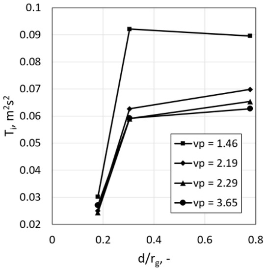 Introducing the relationship between d/rg and the Ti parameter into the description of the hydrodynamics of thermal fluid in u-tube systems, the course of changes in the maldistribution of thermal fluid in the studied u-tube geometries was determined (Figure 13). By performing the above analysis as a function of the fluid flow velocity, it was shown that the turbulent flow intensity factor Ti for the recommended flow velocities is distributed differently compared to increased velocities. A significant decrease in Ti gain with increasing fluid velocity may result in a smaller heat transfer process efficiency increment than expected from the increased flow velocity. The limiting value of the geometric parameter d/rg, above which a change in curvature no longer causes significant increases in flow turbulence, was found to be 0.3. Above this value, the increase in the Ti coefficient does not exceed 10.2% of its maximum value (the case of vp = 2.29 m/s), and it should be remembered that the flow of the fluid under these conditions causes an increase in pressure drop of 125 Pa.