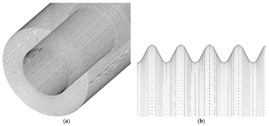 The software ICEM 2020 R2 was used to establish a three-dimensional geometric model of the threaded tube and meshed the geometric model. Figure 1 shows the sketch of the geometric model. The working fluid R134a flowed and boiled in the 3.715 mm gap formed by tubes with an inner diameter of 8.57 mm, an outer diameter of 16 mm, and a length of 100 mm. The front 10 mm and the end 10 mm of the inner tube were smooth, and the other positions were set by standard threads. The simulation used a 55° sealed tube thread with a thread tooth height of 0.581 mm and a pitch of 0.907 mm. In order to improve the precision of the VOF model, the O-block mesh was adopted for the geometric model of the threaded tube shown in Figure 2a. The mesh of the heating wall generated by ICEM is depicted in Figure 2b. The mesh on the heating surface was refined when meshing, considering the minimum departure diameter of the R134a bubble was about 0.1 mm, and the first layer of mesh was set to 0.11 mm. Through an analysis of the simulation results, the number of grids was adjusted repeatedly. Finally, the generated number of grids in the gap was 6638208.