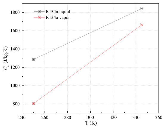 The Lee model is a dynamic model that is driven by temperature difference and has obvious physical sense. The bubbles’ motion can be expressed more clearly by the Lee model. At the same time, UDF is imported into the Fluent solver to redevelop the Lee model, so as to construct R134a bubbles more accurately. More details can be found in the author’s previous work [32]. The Lee model [33] is selected as the phase change model in Equations (9)–(11):