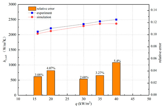 For the above-built subcooled flow boiling model, the validation of the simulation was performed by Chen’s [35] experiment data. The heat transfer coefficient was calculated based on Equation (12) and was used as the validation index of the model.