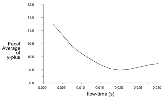 During the simulation, the value of y+ was monitored as shown in Figure 5. The value of y+ is in the range of 7~14, which meets the requirements of the turbulence model, and tends to be stable with the extension of simulation time. It proves that the method used and the number of grids are appropriate.