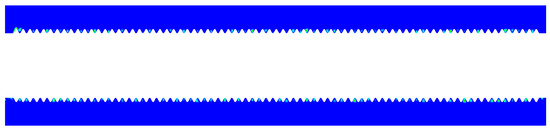 Bubble behavior during subcooled boiling in the threaded tube is observed clearly at conditions of 300 kW/m2 heat flux, 0.4 m/s inlet velocity, and 4 K subcooling. The process of bubble nucleation in the threaded tube is shown in Figure 6, which shows there is a bubble nucleation in each cavity. The reason behind this is that the liquid in the cavity is strongly heated. The simulation further confirms that bubble nucleation forms easier in the cavity. Furthermore, it is inferred that the increase of the cavity provides the possibility to further enhance the subcooled boiling heat transfer. However, for a certain tube length, the space of a single cavity will be reduced due to the increasing cavity density, which affects the radial and axial growth of bubbles in the cavity. The smaller bubbles or even the coalescence of bubbles after departure might negatively impact the heat transfer [37].