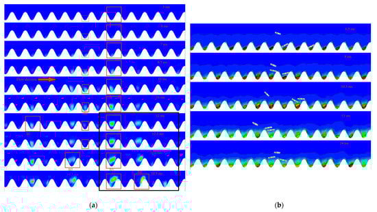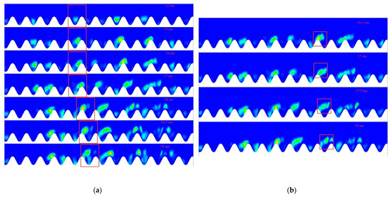 As discussed above, bubbles appear to cross the cavity. Figure 8 shows the coalescence and breakup behavior of the bubbles after crossing the cavity. The bubbles generated in the cavity of the threaded tube will occupy the cavity and grow alone. There is no possibility for the coalescence of bubbles during the growth of the cavity. Therefore, the coalescence needs to be carried out across the cavity and requires the growth of bubbles in adjacent cavities. Bubble coalescence is realized after the bubbles in Figure 8a meet the conditions. If the bubbles growing across the cavity do not encounter the bubbles in the adjacent cavity, the breakup behavior occurs, as shown in Figure 8b. The analysis suggests that this may be related to the temperature field and flow disturbance. Both sides of the cavity provide a hot environment, and the upper part of the cavity is cooled by the main stream, so the temperature field is distorted, and the bubble breaks under the action of surface tension. Whether it is bubble coalescence or bubble breakup, the heat transfer of bubbles is enhanced. The possible reason is that the bubble coalescence and breakup disturb the fluid, which aggravates the degree of turbulence and promotes the convective heat transfer between the bubble and the main fluid. Therefore, the way to enhance heat transfer in this study is to promote the exchange of bubbles across the cavity as much as possible.