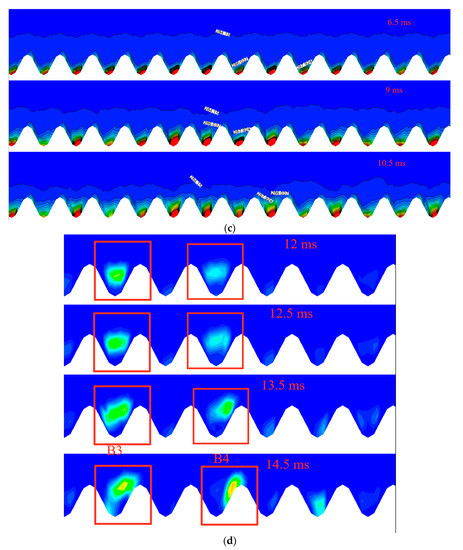 Figure 7a shows the entire growth of five kinds of bubbles, the bubbles are marked with a red box, and B is the abbreviation of bubble. Bubble B1 shows the process of nucleation, growth, and departure in the cavity. It can be seen from Figure 7a that bubble B1 nucleated at 10 ms and then departed at 12.5 ms. Bubble B2 shows the classical process of bubble growth in subcooled boiling, including bubble nucleation, bubble growth, bubble departure, and collapse. To be more concrete, the process of bubble growth can be described by time. The bubble B2 nucleates under surface tension at 5 ms, grows with increasing size during 5 ms and 11 ms, departs from the heating wall during 11 ms and 12 ms, and collapses in cold liquid. The bubble growth in the cavity shows certain characteristics. Bubble B2 grows along the radial direction, and the growth of bubbles B1, B3, B4, and B5 also have this growth characteristic. Unlike bubble B2, the other bubbles do not collapse after departure but grow in the axial direction. It is explained that there is a special evolution of the temperature field in the cavity as shown in Figure 7b. It can be seen from Figure 7c that the temperature gradient between bubble B2 and the upper main stream cold fluid is greater than that of other bubbles at 10.5 ms. According to the speculation, this shows that bubble B2 is prematurely affected by the temperature of the main stream cold fluid during the growth process, resulting in bubble B2 being condensed by the main stream cold fluid before departure. The temperature field at 6.5 ms and 9 ms provides a growth environment for the radial generation of bubbles, while the temperature field at 10.5 ms provides an environment for the axial growth of bubbles. Interestingly, bubble growth in the threaded tube is different from that in the smooth tube. There is no bubble sliding during the bubble-growth process, which may be related to the hindrance of the threaded structure. In addition, the bubble contacts the cavity wall due to the axial growth and flow effects of the bubble after departure, such as bubbles B3, B4, and B5. Figure 7d shows the zoomed view of bubbles, which are marked with a black box in Figure 7a. It is observed that the bubble re-contacts the heating wall and then grows again. The continuous growth of the bubble provides conditions for the bubble to communicate across the cavity, which will be discussed below.