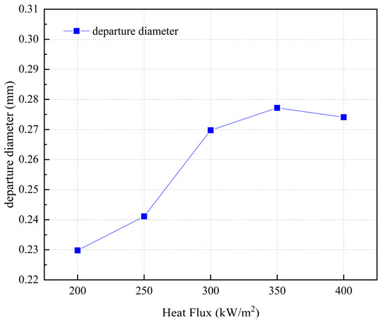In addition, the influence of heat flux, inlet velocity, and inlet subcooling on bubble departure diameter is investigated at the condition of 0.581 mm tooth height. Figure 9, Figure 10 and Figure 11 present the bubble departure diameters at different heat fluxes, inlet subcooling, and velocities. It is found that the bubble departure diameter increases with the increase of heat flux from 200~400 kW/m2 and inlet subcooling from 3~20 K while decreasing with the increase of inlet velocity from 0.2~0.6 m/s. The effect of heat flux on bubble departure is manifested in two aspects. On the one hand, the heat flux directly heats the gas in the bubble, which increases the volume of the bubble. On the other hand, the heat flux of the bubble provides a superheating environment for the bubble, so that the bubble can expand around, and these two advantages are more pronounced under high heat flux conditions. However, in the range of 300~400 kW/m2 heat flux, the bubble departure diameter does not change much, which may be related to the influence of the thread structure, the bubble reaches a certain size and then departs from the heating wall. When the bubble grows to a larger size, the limitation of the thread is reflected. And the bubble velocity is constant, which may also be one of the reasons why the bubble departure diameter does not change much. But when the heat flux is greater than 350 kW/m2, the bubble departure diameter decreases. It is speculated that the effect of buoyancy on bubbles is enhanced under high heat flux, promoting the radial departure of bubbles.