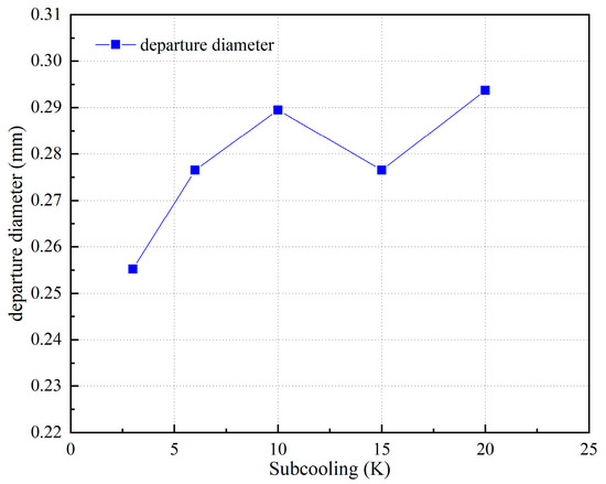 According to Figure 10, as the inlet subcooling increases, the bubble departure diameter clearly increases. This contributes to the enhancement of the Marangoni effect when inlet subcooling increases, and adds enough heat flux provided by the heating wall, which results in the augmentation of the bubble departure diameter. Under a certain degree of subcooling, a temperature gradient will be generated and the surface tension dominated by the temperature gradient causes the interface to move to a lower temperature region. It should be noted that the heat provided by the wall is sufficient to increase bubble size, otherwise, the bubble will be pulled away from the wall by the interface. But when the inlet subcooling is 15 K, the bubble departure diameter decreases. It is speculated that the temperature field in the threaded tube has changed greatly due to the effect of the threaded structure at the inlet subcooling of 15 K so that the unstable turbulence in the threaded tube is intensified, which affects the surface tension of the bubble [39].