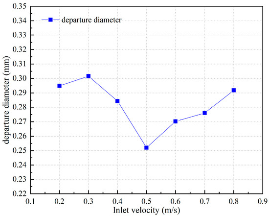 Figure 11 shows that the bubble departure diameter decreases as inlet velocity increases, which is mainly owed to the suppression of the main stream. The main-stream velocity increases at high inlet velocities, resulting in an unstable bubble-growth environment. And, under the condition of high-inlet velocity, the shear force acting on the bubble increases, thus promoting the departure of the bubble. The main stream has the strongest suppression on bubble growth at the inlet velocity of 0.5 m/s. When the inlet velocity further increases from 0.5 m/s, the bubble departure diameter increases. It is speculated that when the inlet velocity continues to increase, the influence of the main stream on the adjacent thread cavities far from the main stream is decreased, and the protective effect of the thread on bubble growth is greater than the suppression of the main stream in the threaded tube on bubble growth. Therefore, the bubble departure diameter gradually increases. The effect of inlet velocity on bubble departure in the threaded tube is significantly different from that in the smooth tube. In the previous work, it was found that the bubble has a certain axial velocity during the slide process, and further slides and grows until departure under the action of inertial force.