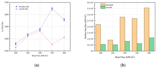 The heat transfer coefficients of the threaded tube and the smooth tube (a) and the surface heat fluxes associated with bubble growth in both threaded and smooth tubes (b).