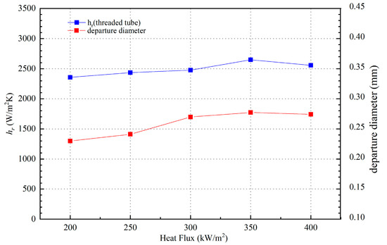 The bubble phenomena in subcooled boiling in threaded tubes show that bubbles in the cavity grow radially to a certain size at nucleation sites and then depart from the heating wall. The bubble diameter was introduced to investigate the heat transfer in a threaded tube, which is calculated by Equations (14) and (15) of Han and Griffith [38]. In the previous study of subcooled boiling in smooth tubes, the authors found that bubbles nucleate and slide along the heating surface, grow along the axis and coalesce with other bubbles to form larger bubbles, but most of the bubbles collapse after leaving the wall. According to the investigation, the bubble departure diameter in the threaded tube is between 0.2 mm and 0.3 mm at conditions of 200~400 kW/m2 heat flux, 0.2~0.6 m/s inlet velocity, and 3~20 K inlet subcooling, while the diameter of bubble departure in the smooth tube can reach between 0.25 mm and 0.35 mm, and even 0.4 mm in the smooth tube at the condition of 200~400 kW/m2 heat flux, 0.2~0.4 m/s inlet velocity, and 3~10 K inlet subcooling. Obviously, due to the limitation of the thread, the bubbles cannot slide, and the diameter of the bubble departure in the threaded tube is generally smaller than that of the smooth tube, but the threaded tube enables the bubbles to achieve secondary growth and departure, thereby enhancing the heat transfer.