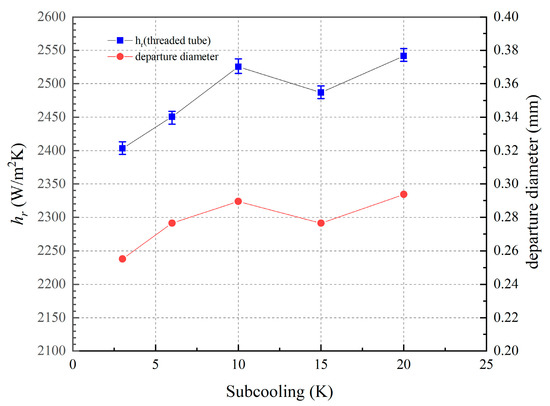Figure 14 exhibits that the heat transfer coefficient varies with the subcooling at the condition of 300 kW/m2 heat flux and 0.4 m/s inlet velocity. It is seen from Figure 14 that the heat transfer coefficient increases as the subcooling raises. Similarly, the heat transfer coefficient increases with the increase of bubble departure diameter. For the subcooled flow boiling of R134a in the threaded tube, the surface tension plays a role in bubble growth and departure. At higher subcooling, a larger temperature field results in a larger surface tension gradient, which exacerbates the convection between the main stream and the bubble.