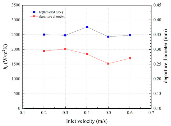 Figure 15 shows that the heat transfer coefficient varies with the inlet velocity at the condition of 300 kW/m2 heat flux and 4 K subcooling. From Figure 15, the maximum heat transfer coefficient is obtained at 0.4 m/s. It is inferred that the inlet velocity of 0.4 m/s provides a good velocity field for bubble growth because a lower inlet velocity slows down the convective cooling of the bubbles, while a higher velocity inhibits the growth of the bubbles and prevents heat from being taken away in time. The velocity field formed by the main fluid in the threaded tube is more consistent with the threaded structure. At this time, the influence of the velocity field on both sides of the thread is more balanced, so that the shape of the bubble is more regular and the heat transfer is promoted. Different from the temperature field, the thread structure has a greater influence on the velocity field. The heat transfer coefficient and the bubble departure diameter no longer have the same trend. The thread increases the degree of turbulence near the heating wall, resulting in a weakening of the relationship between the heat transfer coefficient and the bubble departure diameter. Analyzing the effects of heat flux, velocity, and subcooling on the heat transfer coefficient, it is found that the heat transfer coefficient depends on the temperature field and velocity field of the bubble.