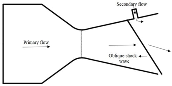 Shock vector control is an FTV technique that introduces a secondary fluidic flow injection in the divergent portion of the convergent-divergent nozzle. The disturbance caused by this injected flow generates an oblique shock wave due to the low-pressure region downstream of the injection port. The interaction of the oblique shock wave with primary flow deflects the flow supersonically, thus resulting in thrust vectoring. A schematic of SVC is shown in Figure 2.