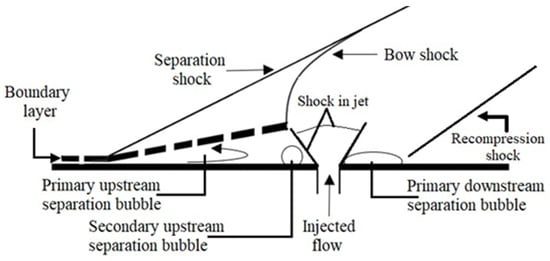 For SVC, an axisymmetric conical supersonic nozzle has also been theoretically, experimentally, and numerically studied [39]. The geometric parameters of 3D circular sonic injection into the supersonic region of the nozzle were investigated for NPR of 37.5 with variable SPR. The results indicated that TV through secondary flow was dominantly affected by the inclination and position of injection in the nozzle [40]. A circular injector port was used for penetrating the secondary flow in the divergent part of the nozzle and could generate a strong shock to deflect the primary flow. Figure 3 signifies the schematic of the flow field with slot injection. When a secondary flow was injected into the primary flow, the flow encountered a bow shock wave with various viscous and boundary layer interactions. Due to an adverse pressure gradient, weak shock waves appeared at the initial separation point [41,42]. However, as the boundary layer got close to the secondary fluidic injection port, the separation deepened and allowed the formation of a strong bow shock wave. This strong bow shock wave was caused due to the compression fan interaction. The region of recirculating bubbles was observed both upstream and downstream of the nozzle, as well as the injected upstream region [43,44]. The primary flow, when crossing from the separation point, attached the bow shock to itself and continued its motion forward. Sometimes, the interaction between the primary and secondary flow caused the formation of a more complex reflection of the shock wave, including surface effects [45,46].