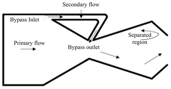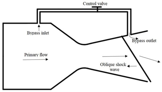 A bypass flow injection has been investigated to control the deflection angle [53,54,55,56]. To minimize the influence of secondary injection and to maximize the thrust vectoring angle with minimal thrust loss, a bypass passage flow SVC was conceived. A control valve was used to control the bypass flow rate. It was observed that with increasing the bypass flow rate, there was an increase in thrust vectoring angle as well. With a bypass flow of less than 10%, 10° thrust vectoring was achieved [57]. Figure 4 signifies the bypass SVC schematic for TV.