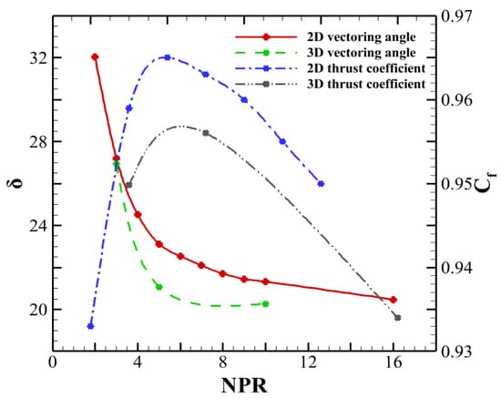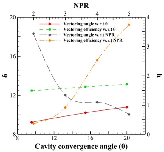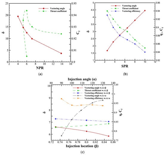 A graphical representation of these parameters, which includes the effect of NPR, the effect of SPR, injection location, and injection angle, is presented in Figure 5. All the trends observed for these parameters were obtained from the data available in the literature. The trend for vectoring angle and vectoring coefficient at different NPR were observed in Figure 5a. Vectoring angle showed a decreasing trend with increasing NPR, whereas the thrust coefficient was observed to increase for NPR < 6.5 and decrease for NPR > 6.5. It was reported that increasing NPR resulted in eliminating the shock and improving the separation in the nozzle, which improved the thrust but degraded the vectoring angle [22,48]. Figure 5b refers to the trend of vectoring angle, vectoring efficiency, and thrust coefficient at different SPRs. An increase in vectoring angle was reported, whereas a decreasing trend for vectoring efficiency and thrust coefficient was observed. At larger SPR, the interaction of shock with the upper wall induced thrust losses and resulted in larger pressure loss [39]. Similarly, Figure 5c reported an increasing trend in the vectoring angle with increasing injection angle and injection location. Increasing the injection angle and injection location had a negative impact on vectoring efficiency and thrust coefficient [39,48].