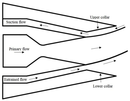 The counter-flow thrust vectoring technique involves a secondary fluidic flow penetrated in the opposite direction of the primary flow. Usually, in the counterflow technique, the application of suction creates a secondary fluidic flow stream and produces an asymmetric flow in the primary fluid. The difference between co-flow and counter-flow thrust vectoring control is that the former involves momentum injection, while the latter uses momentum removal for controlling the primary flow. CFTV can achieve large TV angles by using suctions between the nozzle’s trailing edge and an aft collar. Figure 6 details the CFTV schematic for the TV.
