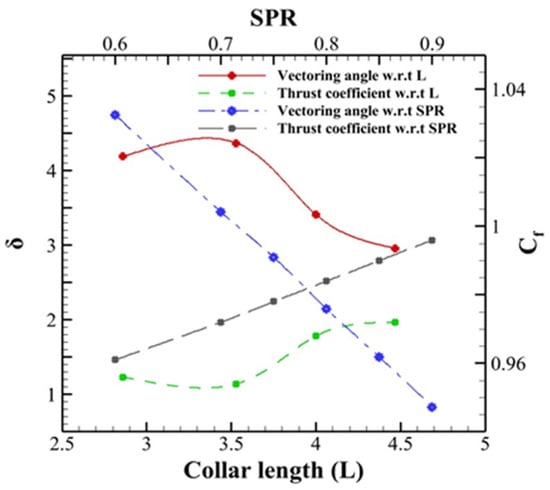 At different NPRs, the effects of various characteristics for a Mach number of 2.5 on TV performance for CFTV were investigated. For NPR = 15–17 and 18–20 values, at a constant SPR of 0.8, it was observed that with increasing the NPR, the primary MFR increased, and thus, the MFR of secondary flow decreased. For SPR of 0.9–0.6, a low value of secondary mass ratio (0.6%–2.3%) was reported. It was found that with a decreased value of SPR, an increased value of thrust loss was achieved. The deflection angle achieved for the SPR value of 0.6 was 5.5°. For an SPR value of 0.8, the MFR of secondary flow was obtained between 0.9% and 2.4% [64]. A study was conducted at an NPR range of 3.5–10 values for a collar length of 8 inches (100% and 50%) with different suction slot heights. When comparing 50% and 100% collars, the latter was found to produce the largest TV angle. Upon decreasing the slot height, the decreasing behavior of the resultant thrust ratio was obtained [67]. Several parameters have been examined for fluidic counterflow control. A few parameters and their effects on TV for different configurations are compiled in Table 3. A graphical representation of the effect of SPR and collar length is presented in Figure 7. All the trends observed for these parameters were obtained from the data available in the literature. Vectoring angle showed a decreasing trend with increasing SPR, whereas the thrust coefficient was observed to increase with increasing SPR. At constant NPR = 17, the performance of vectoring angle and thrust coefficient reported was better for high Mach conditions. Another important parameter affecting the performance of CFC was collar length. A decreasing trend for vectoring angle and an increasing trend for thrust coefficient at varying collar lengths were observed [64,68]. A summary of some numerical investigations carried out on CFTV is presented in Table 4.