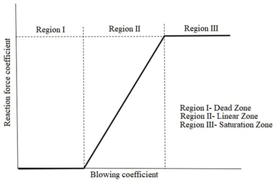 Different configurations for co-flow were investigated numerically and experimentally by researchers. The effects of multiple jet geometries on the effectiveness of TV were examined, and a new model was designed for low-speed aircraft. It was found that the effectiveness of TV depended upon the secondary flow height and the diameter of the Coanda surface. The control response curve for co-flow consisted of three significant zones during the investigation. The primary zone, known as the dead zone, had a nearly steady magnitude for thrust vectoring angle. This zone occurred when the secondary flow separated from the Coanda surface at a low speed. The second zone was known as the linear zone. The vectoring angle increased by expanding the blowing proportion. Since the vectoring angle could not surpass the mathematical point of the collar, flow proportions past the cut-off value had a slight impact on the thrust vector angle. This zone was called the saturation zone that existed because of physical impediments [83]. The three significant zones of a control response curve are presented in Figure 9. The investigation of a 2D exhaust nozzle with a small gas turbine demonstrated a maximum angle of 23° achieved during the experiment on a 57 mm radius collar and 1.4 mm height of secondary flow. The result demonstrated that the TV angle increased with increasing the primary and secondary flow rates [84]. Varying secondary flow height for a constant diameter of Coanda surface on TV effectiveness for a 3D rectangular duct was investigated. The observed trend data indicated that for a secondary flow height of 0.0294, the vectoring angle obtained was 28.7° for a constant diameter of 3.35 mm. Increasing the secondary flow height resulted in a decreased TV angle. A dead zone appeared for a low secondary flow blowing rate which resulted in no flow control and a low thrust vector angle. The length of the dead zone depended upon the diameter of Coanda surfaces. The large diameter resulted in a short period of the dead zone. Once overcoming the dead zone, the thrust vectoring increased with an increase in mass flow ratio [85].