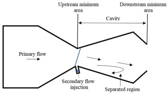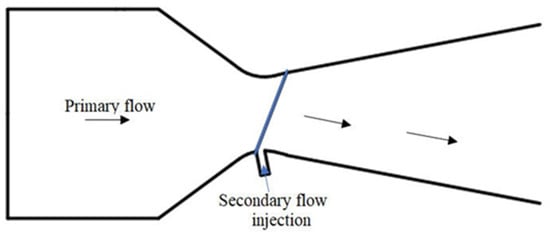 The throat skewing control hypothesis is related to the penetration of a secondary fluidic flow resulting in TV by throat shifting. Asymmetric pumping at the throat produces the turning effect in the primary flow. At all operating conditions, the TSC nozzle can achieve thrust vectoring by controlling the secondary fluidic flow injection at the throat and flap of the nozzle [18,92]. TSC is more efficient than SVC, as the latter shuns the shock formation in the divergent part of the convergent-divergent nozzle. Under a vectored state, no new skewed minimum area is created, and the throat occurs on the minimum area of the nozzle. However, a new minimum area is created under a non-vectored state, thus in a subsonic regime. Figure 10 signifies the TS schematic for TV. Different design parameters, such as vectoring angle, thrust coefficient, thrust losses, injector geometry, and flow properties, were investigated for the TS nozzle. The throttle performance for jet area control was studied, making sure that jet area control was not compromised by the throttle performance.