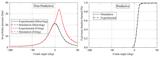This study implemented a 0D/1D simulation through Gamma Technologies’ GT-Power (version: 2022.0.7501) software platform based on the TPA method [30,38,39]. This modelling approach combines Woschni’s heat transfer correlation and the two-zone combustion concepts to simulate the behaviour of the engines [40]. The simulated data was validated by comparing it with the experimental data, ensuring the accuracy and reliability of the simulation [36]. Figure 2 illustrates a comparison between the experimental and non-predictive simulation results of hydrogen combustion at CR 9, demonstrating a close agreement and affirming the accuracy of the model.