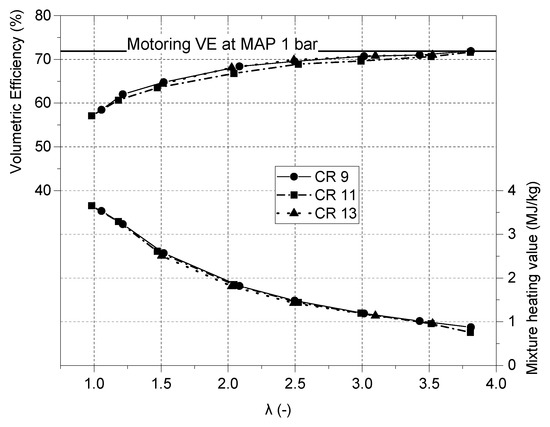 VE and mixture heating value over a range of air–fuel ratios for different compression ratios.