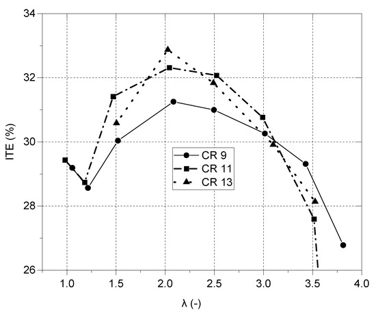 Additionally, with CR 9, the hydrogen–air mixture undergoes further complete combustion, resulting in higher thermal efficiency. However, as the CR increases, the combustion process becomes more constrained, and the mixture becomes less homogeneous, leading to decreased efficiency. Also, at λ values beyond 3, the engine operates under lean conditions, which reduces combustion stability and efficiency due to the reduced heat losses and increased pumping losses. The combination of lean operation and a lower CR (CR 9 in this study) promotes better combustion, leading to higher ITEs compared to other CR conditions.