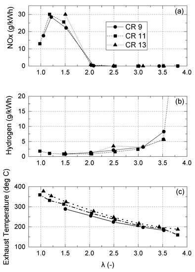 Engine-out emissions (a) NOx, (b) H2, and (c) exhaust gas temperature over a range of λs for different compression ratios.