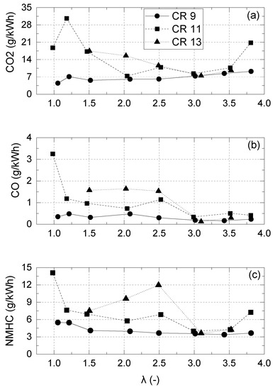 Engine-out emissions: (a) CO2, (b) CO, and (c) NMHC over a range of λs for different compression ratios.