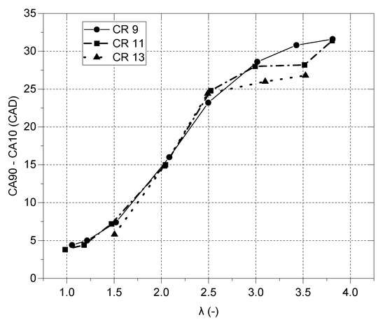Combustion duration (10–90% mass fraction burned duration) over a range of λs for three different CRs.