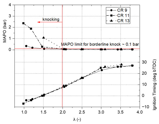 MAPO and ignition timing over a range of tested λs for three different compression ratios.