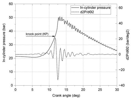 Example of knock point detection for CR = 9 using the second derivative of the in-cylinder pressure trace.