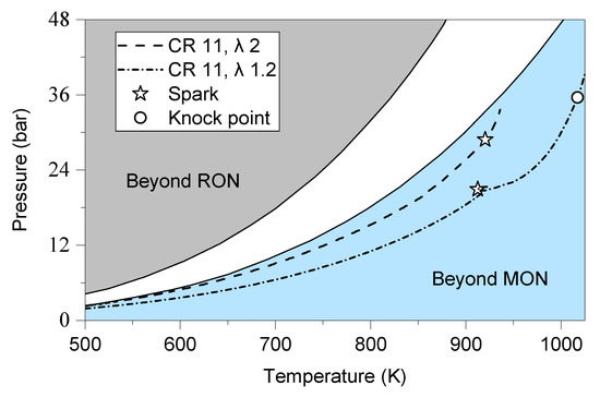 Pressure–temperature trajectory of H2 for λ = 1.2 and 2 at CR 11 and 600 RPM. Standard RON and MON regions were taken from [48].