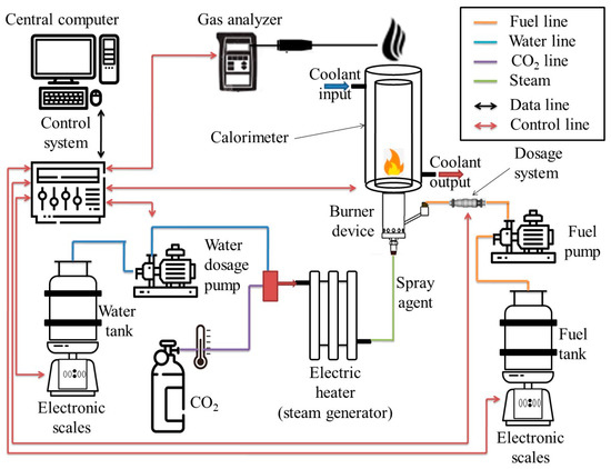 The experiments were carried out on an experimental setup for studying the soot–steam regime of the combustion of liquid hydrocarbons, which is part of the unique scientific installation, USI, “Large-scale thermohydrodynamic stand for the study of thermal and gas-dynamic characteristics of power plants” [54]. The installation consists of a burner, a water supply system, a carbon dioxide supply system, an electric steam generator for superheating steam and heating carbon dioxide to a predetermined temperature, and a liquid fuel supply system (Figure 2). A stable mass fuel flow rate is set by a pump and a fuel injector; to control the fuel flow rate, the fuel tank is mounted on an Acom PC-100W-10H electronic scale. The water flow is set by a plunger dosing pump and is controlled according to data from the Acom PC-100W-10H electronic scales, where a water tank is installed.