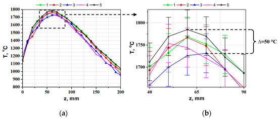 On the right side of Figure 3, we can see that the difference in the temperature maximum (indicated in the figure as ∆) for all the regimes does not exceed 50 degrees and is in the region of 1750 °C. This can be explained by the similar effect of increasing the mixture heat capacity when a jet of steam or carbon dioxide is added. Although CO2 has a lower heat capacity (~1.9 times) than steam, it is supplied in a larger amount (~1.63 times when comparing regimes 1 and 5); as a result, a similar effect of diluting the combustible mixture is achieved.