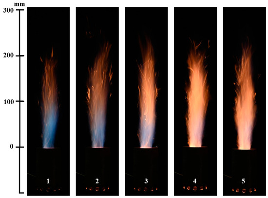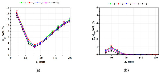 It is easy to see from Figure 4 that the same flame length is observed for all the modes, which corresponds to the thermocouple measurements. Next, the gas components are analyzed along the vertical axis of the flame, and the final combustion products are measured.