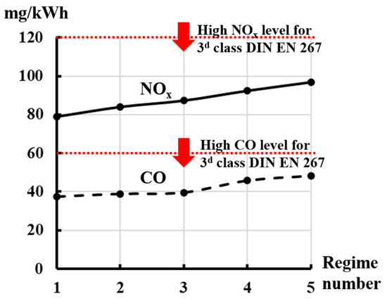 It should be noted that the volume of carbon dioxide introduced in the limiting case (regime 5, see Table 1) does not exceed 6% of the theoretical volume of combustion products and that the use of these formulas allows us to avoid underestimating emissions when using a diluent gas and to carry out a correct comparison with the DIN EN 267 standard [56].
