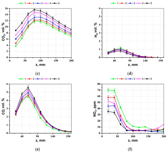 The maximum value of the CO2 content in the flame increases when the steam is replaced with carbon dioxide. The difference in values for the extreme regimes (11.8 vol. %—regime 1; 15.6 vol. %—regime 5) corresponds to the additional amount of carbon dioxide introduced with the sprayer. The CO concentration is at its maximum at a distance of ~60 mm from the burner nozzle and decreases with an increase in the proportion of steam in the sprayer (5.6 vol. %—5 regime; 4.6 vol. %—1 regime), which may be due to the presence of OH radicals in the combustion zone and more intense oxidation of CO to CO2. Such a decrease in CO concentration is also observed for the final products of combustion, which was noted earlier. In addition, for the regimes with high steam injection, a slight increase in H2 concentration in the flame (up to 0.4 vol. %) is observed, which is explained by steam gasification with the formation of synthesis gas (H2O + C → CO + H2). The content of nitrogen oxides in the flame decreases with the distance from the burner nozzle, due to the dilution of the flame with air from the environment and a decrease in the flame temperature (longer than 60 mm). At the same time, at a distance of 200 mm from the burner nozzle, the NOx concentration is lower for those regimes where the proportion of steam in the atomizer jet is higher. A similar dependence is also observed for the final products of combustion.