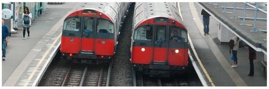 The ground-level power supply, or “hidden rail” system is a power transfer method that alongside OCS, is used to power both LRV and traditional subway systems [14]. Hidden-rail is classified as a ground-level power supply, where power transfer is achieved through a ground-level connection. The most common implementation of this system is the third rail system (TRS). TRS consists of two primary components: a third rail that runs parallel to the primary rails of the track, as well as a connection/support device point on the underside of the LRV bogey [15]. In this way, a similar effect of the OCS system can be achieved, where a direct contact connection is utilised for power transfer, but with distinct advantages. TRS, due to its location and lack of exposed components, results in a more robust power transfer system [16] and one that is resistant to electromagnetic interference [3]. TRS is often cheaper to implement than OCS, due to not requiring support frameworks and extended maintenance schedules [15,17]. Figure 2 shows a traditional implementation of TRS in the London Underground [18].