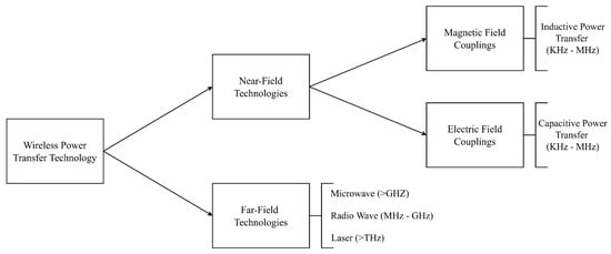 WPT technology is an emerging technology that enables the transfer of electrical power through a medium other than typical metal cables or connections. Power is transmitted across a medium, such as air, using the energy of fields moving through that medium. This emerging technology has been applied to consumer electronics and healthcare devices and has shown benefits for both end-user and industrial applications and applications such as EV and LRV [25,26]. There are various existing modalities of WPT, as shown in Figure 3, that enable power transfer at various application scales.