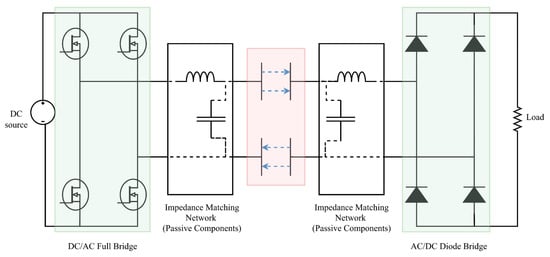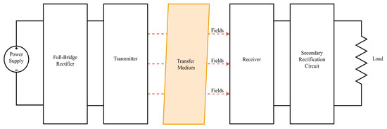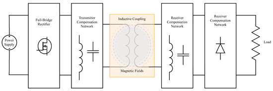 IPT operates based upon the action of Ampere’s and Faraday’s laws [26]. The field generated by the current in the primary side coil is ‘received’ by the receiving side, and a current is induced in the secondary coil, thus allowing the transfer of power through a non-traditional medium [34]. IPT is considered a form of magnetic resonant coupling (MRC), as the compensation network made up of inductors and capacitors allows the coupling to operate at resonance, with operation in the kHz–MHz range, with power transfer tied to this frequency [35]. Figure 5 shows the operating structure of an IPT system, where the main components are shown as block elements.