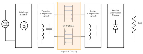 CPT has experienced increasing interest over the last seven years, with PT and efficiency increasing steadily as further investigation is conducted into the viability and applicability of this emerging technology. CPT is often considered the main technological alternative (for achieving near-field WPT) to IPT [26,28,34,41]. CPT utilises high frequency (kHz to MHz) ac power to generate an electric field that allows the transfer of energy across the gap of non-traditional material (such as air) [28]. This alternating electric field generates a displacement current on the receiving side, hence achieving energy transfer [20]. The major working principle of this technology is derived from the same principles as a typical capacitor, just realised at a larger scale, where the direction of current (and thus electric field) is reversed for every half cycle of the ac operating frequency. Figure 6 shows the operating structure for a typical CPT system in block-diagram form, including the inverter, compensation network, and coupling [42].