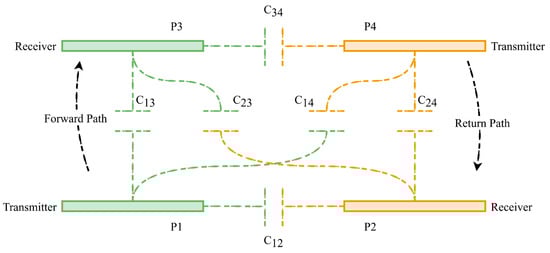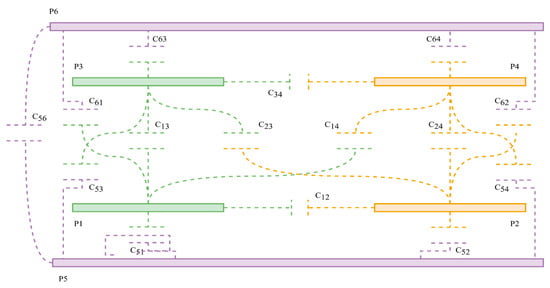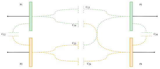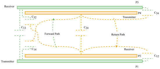 The fundamental principle of capacitance is the formation of an electric field between two metal plates. Due to this natural phenomenon, all the metal surfaces present in the CPT changing environment will inflict a capacitance on each other that form the mutual capacitance [41,45,47,81]. The mutual capacitance is determined by the airgap distance of the coupler, the size of the coupling plates, misalignment conditions, and energy transfer direction [82,83]. Within the CPT coupling environment, any undesirable capacitances that form between adjacent plates are parasitic or internal capacitances (C14, C23, C12, and C34). Figure 8 shows this higher fidelity modelling [41,82], where a four-plate bipolar coupler is modelled as having six capacitances present. The mutual capacitance of such a system is taken at a given point between all four plates and is given by a division of main capacitances by parasitic ones.