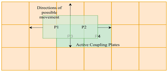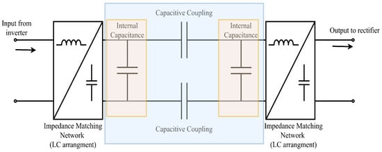 The coupling coefficient is a critical numerical parameter of the CPT system that is tied directly to the efficiency of the overall system. Like in an IPT system [41], the coupling coefficient is a parameter that provides a quantitative measure of the coupling between the plates [84]. The coupling coefficient has a value that is determined by mutual and parasitic capacitances of the coupling plates, and in the case of a typical CPT system, is often in the picofarad range. As such, this parameter is directly informed by the physical size and arrangement of the coupling plates [41,68,84]. In general, the higher the coupling coefficient, the less voltage drop occurs across the coupling. In a typical CPT system as in Figure 7, a change in the coupling coefficient causes a change in the resonance frequency of the system, which leads to a change in voltage drop across the plates. When the coupling coefficient drops low enough, the voltage output can drop all the way to zero [26]. Most CPT systems developed for EV applications, or proof-of-concept designs are “loosely-coupled” CPT systems, where the coupling coefficient is very small (1–5%), with notable examples from [41,47,52,68] where the coupling plate area is under 1 m2.