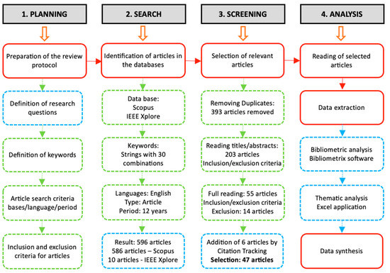 In this context, the SLR selects, analyzes, and synthesizes data from the literature on a given theme [26]. It is an approach used in order for the results to be explicit, extensive, and reproducible and to have high-quality studies [27]. This SLR was conducted according to Tranfield, Denyer, and Smart [28] and Denyer and Tranfield [24], whose studies are in line with PRISMA guidelines. Based on that, a four-step research protocol was adopted: planning, search, screening, and analysis, as detailed in Figure 1.