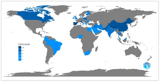 The results showed a greater participation of countries from the Asian and European continents in the studies analyzed, as shown in Figure 3. In the Asian continent, there were a total of 41 contributions, with the most participation from China (11), Malaysia (7), and Pakistan (7). The European continent presented a total of 38 contributions, with Spain (14), Italy (10), and Poland (4) as the main participants. Next, in the American continent, there are a total of 11 publications, with participation from Canada (7), Barbados (2), Brazil (1), and Colombia (1). Finally, the African continent presented three publications and the participation of Egypt (1), Nigeria (1), and South Africa (1). Thus, there is an opportunity for new research in the American and African continents.