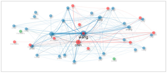 Figure 4 represents the structure of the co-citation network of authors in the analyzed sample that consists of two clusters where each author represents a node. The diameter of the circles is directly proportional to the number of author citations, and the lines indicate the connections between the authors in that cluster. Author co-citation analysis connects bodies of writing by an author and maps their citation image. Thus, it is possible to identify relevant authors in a knowledge area and connect them through citation records [45]. Therefore, it is possible to infer the formation of two main fields of knowledge, represented by different colors. In the field represented by the blue cluster, the most cited authors are Wang, Zhang, Yang, and Li. In the field represented by the red cluster, the main authors are Chen, Hu, Liu, and Ahmed. The intellectual structure network formed highlighted a scientific collaboration between Wang, Lin, and Capozzoli in the blue cluster and Chen, Al-Ali, and Marinakis in the red one.