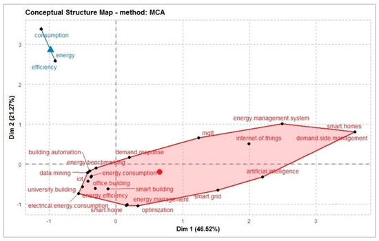 Figure 6 presents a conceptual map by grouping commonly co-occurring authors’ keywords, where it is possible to see the formation of two clusters in two dimensions, i.e., the more similar keywords are in distribution, the closer they are represented on the map [46]. In the red cluster are terms related to energy management (energy management system, demand response, energy efficiency), smart buildings (smart grids, smart homes, smart buildings), and the Internet of Things (Internet of Things, IoT, MQTT, artificial intelligence, automation). It is not possible to observe a significant grouping of terms or the formation of a conceptual field in the blue cluster. Thus, there is only one field of study directed to the study of energy management in intelligent buildings based on the Internet of Things (red cluster).