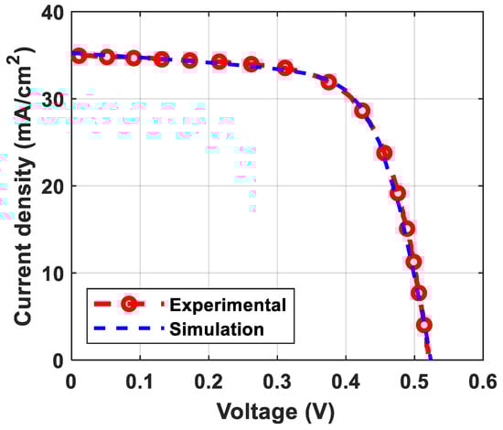JSC, FF, and PCE. The JV curve is the most significant output metric to measure solar cell performance. As a sequence, the JV curves of the simulated cell and the reported experimental work [