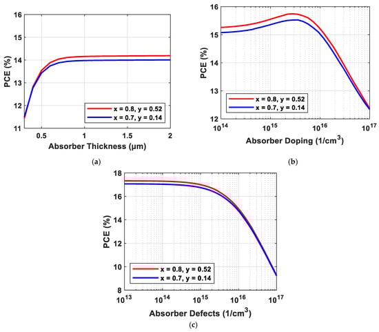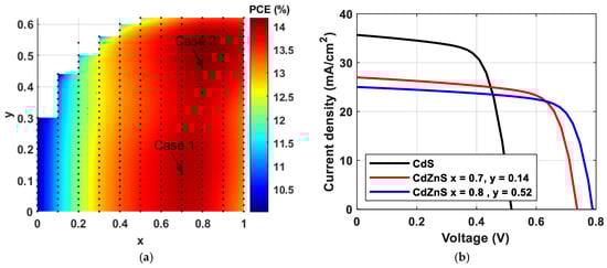 49]. In their experimental study, the authors revealed that the solar cell performance is a strongly coupled function of both x and y compositions. They achieved a PCE of up to 17.7% at specific atomic compositions (x = 0.04 and y = 0.18) [