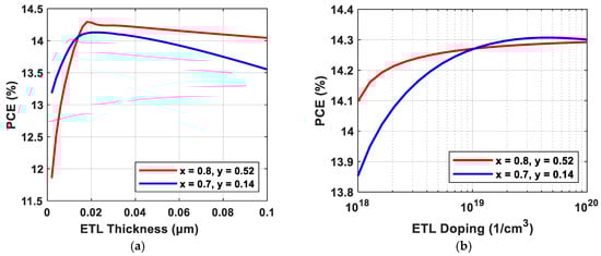 Furthermore, the optimization after the alloy composition codesign of the ETL and absorber compositions started with optimizing the thickness and doping of the ETL of the two optimum cases as illustrated in